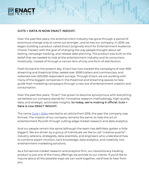 Over the past few years, the entertainment industry has gone through a period of enormous change only to come out stronger... and so has our company. In 2019, we began building a product called Enact (originally short for Entertainment Audience Choice Tracker) with the goal of changing the way people thought about ad testing, campaign tracking, and release date planning. The product was built on the belief that we needed to look at the entertainment industry and its consumers holistically, instead of through a narrow lens of only one form of distribution.